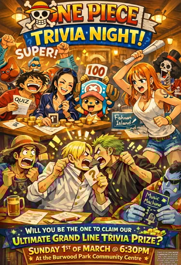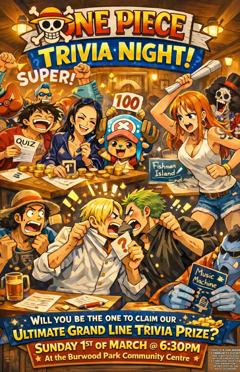 Our ‘Major Seas Stage’ is the first of three One Piece Trivia Nights celebrating the series while testing knowledge and competing for prizes. All One Piece fans and friends of One Piece fans are welcome!